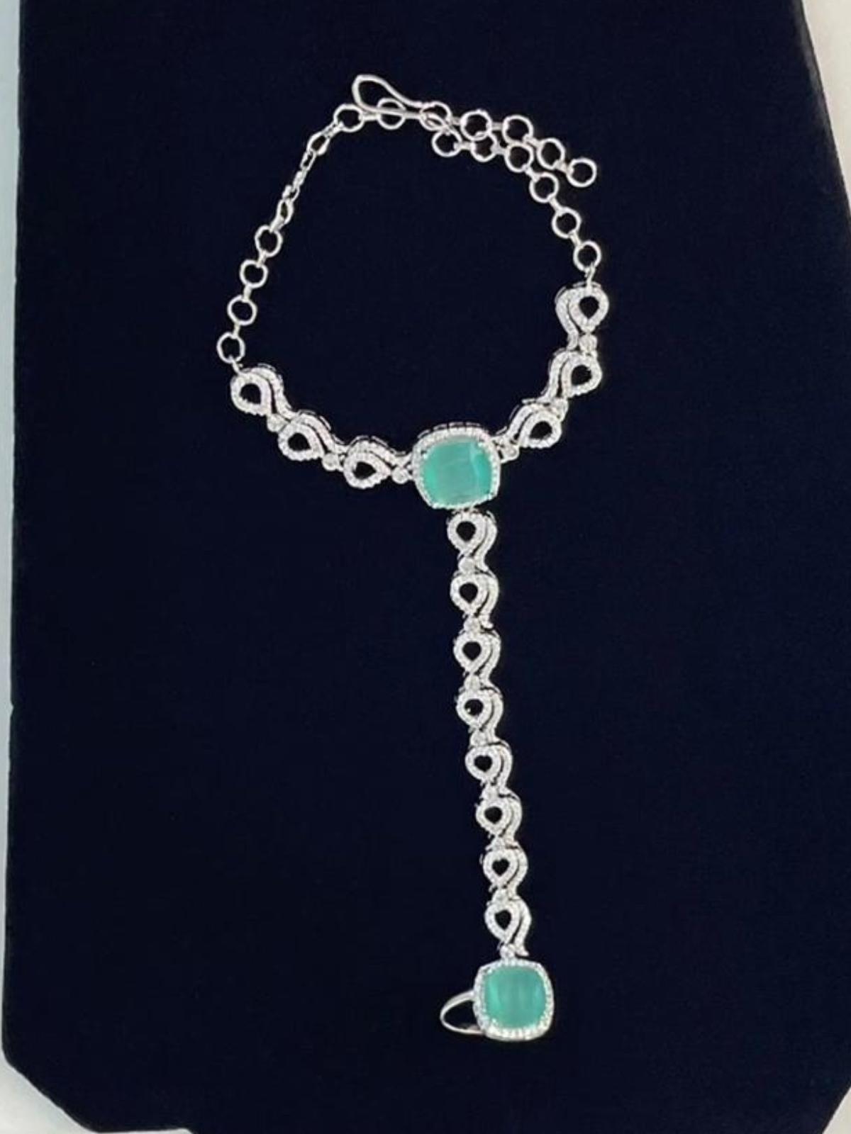 This AD Anja Set in Mint Stone features a stunning American Diamond design paired with a refreshing mint-colored stone, exuding a graceful and luxurious charm.