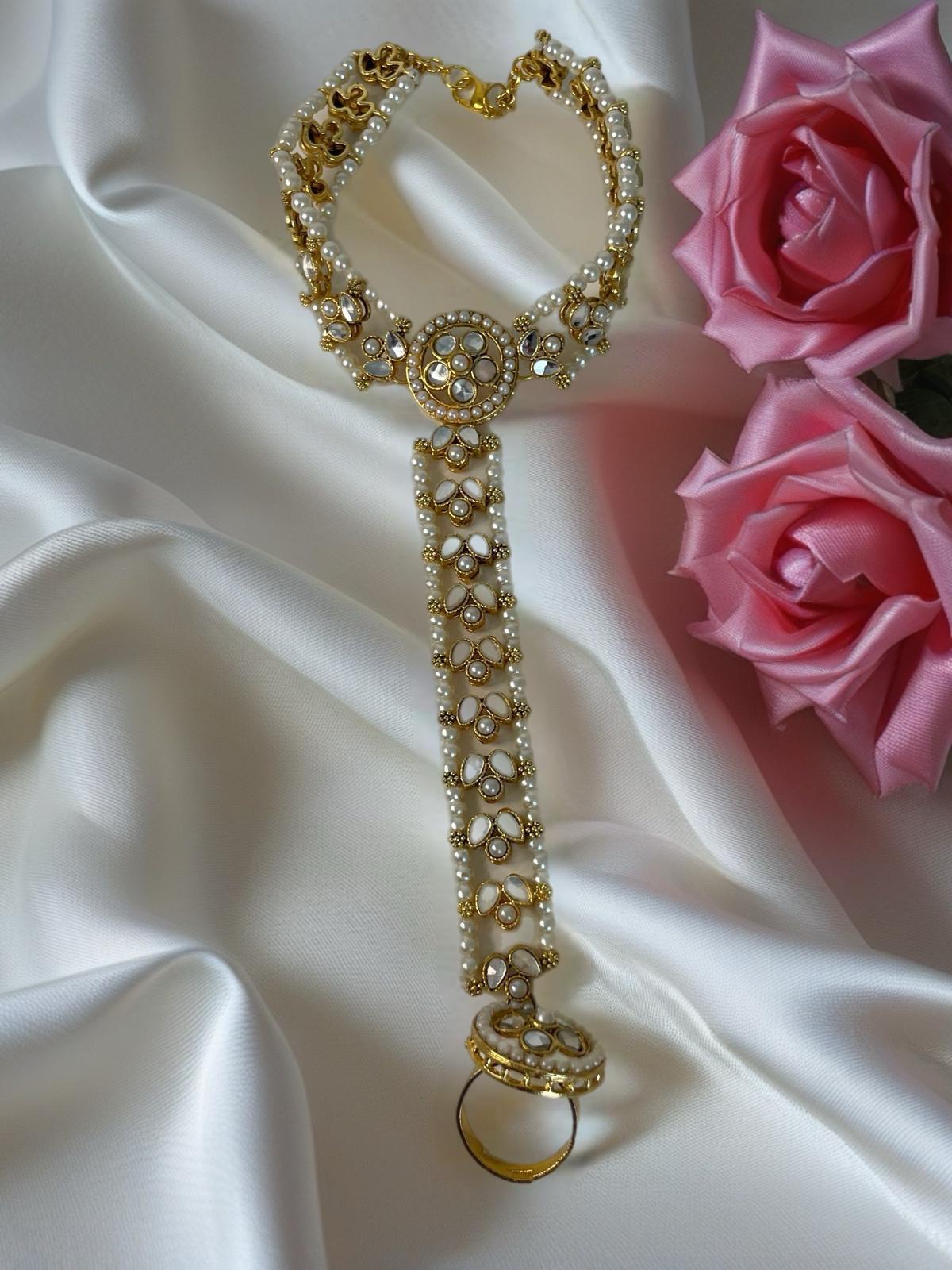 This Kundan Anja Bracelet with Adjustable Ring beautifully blends tradition and elegance. Adorned with premium-quality Kundan stones, the bracelet exudes a royal charm, while the matching adjustable ring adds a touch of grace and versatility.