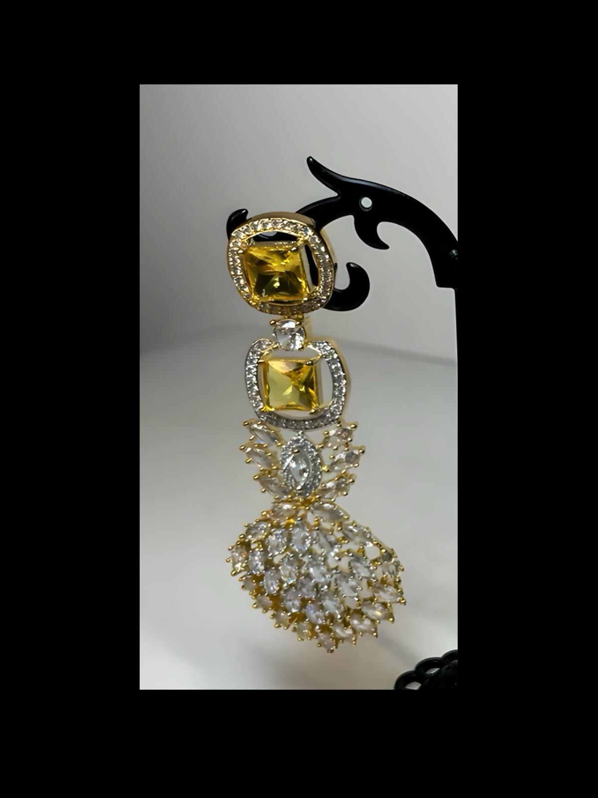 Brighten up your style with these Statement American Diamond Earrings, designed with a striking yellow doublet stone at the center. The vibrant yellow hue brings warmth, energy, and sophistication, while the surrounding sparkling American Diamonds enhance the brilliance and add a touch of glamour.