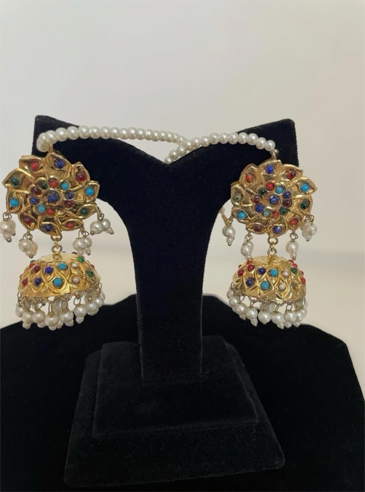 Elevate your traditional look with this exquisite gold-plated Multani Navratan jhumka. Adorned with vibrant Navratan stones, this timeless design celebrates cultural heritage with a modern touch. The elegant pearl saharay add movement, grace, and sophistication, making it the perfect statement piece for weddings, festive occasions, or cultural gatherings.
