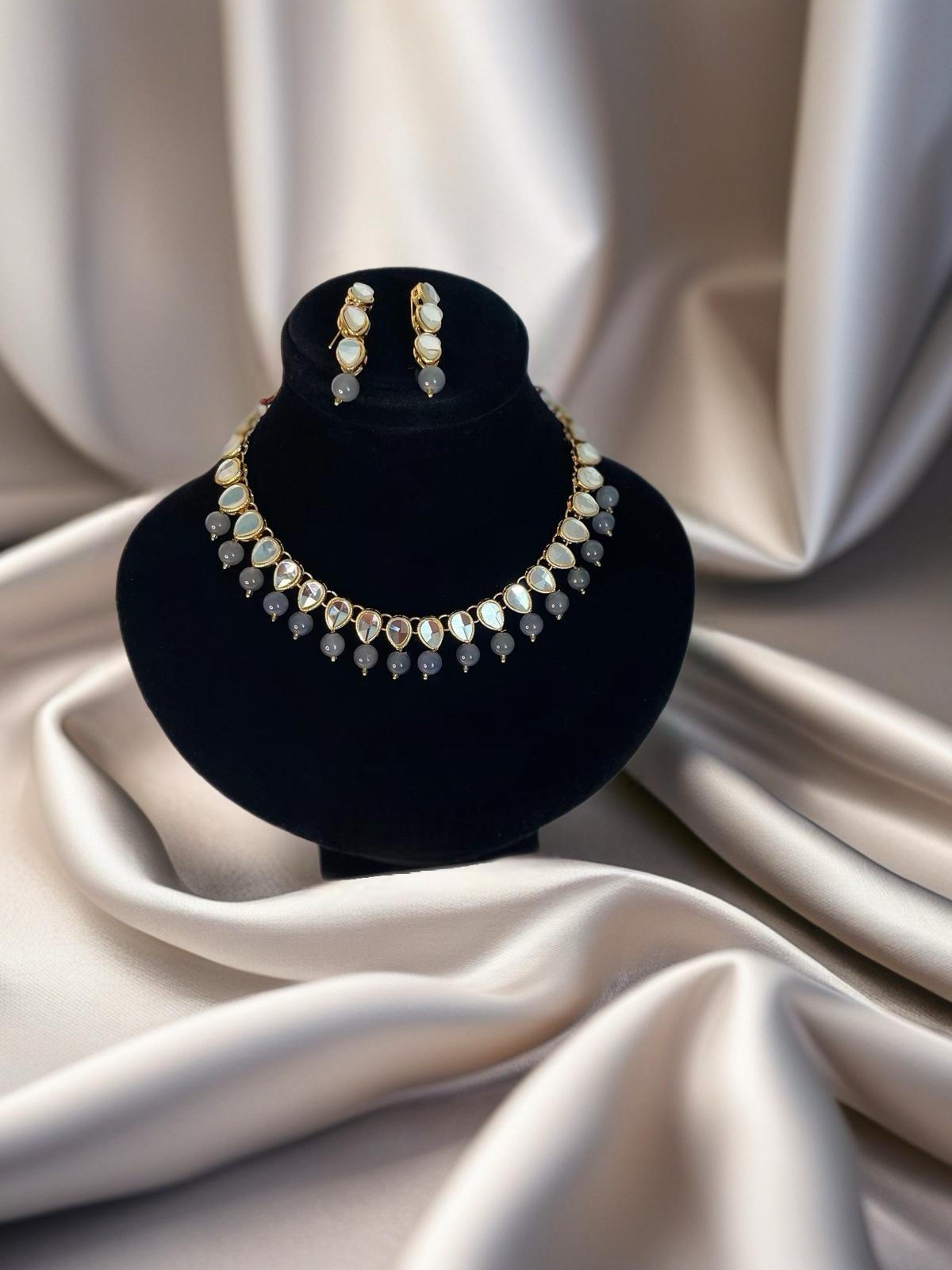 This Kundan Necklace Set with Grey Pearls beautifully blends traditional artistry with modern sophistication. The soft shimmer of grey pearls paired with intricate Kundan detailing creates a graceful and timeless appeal.