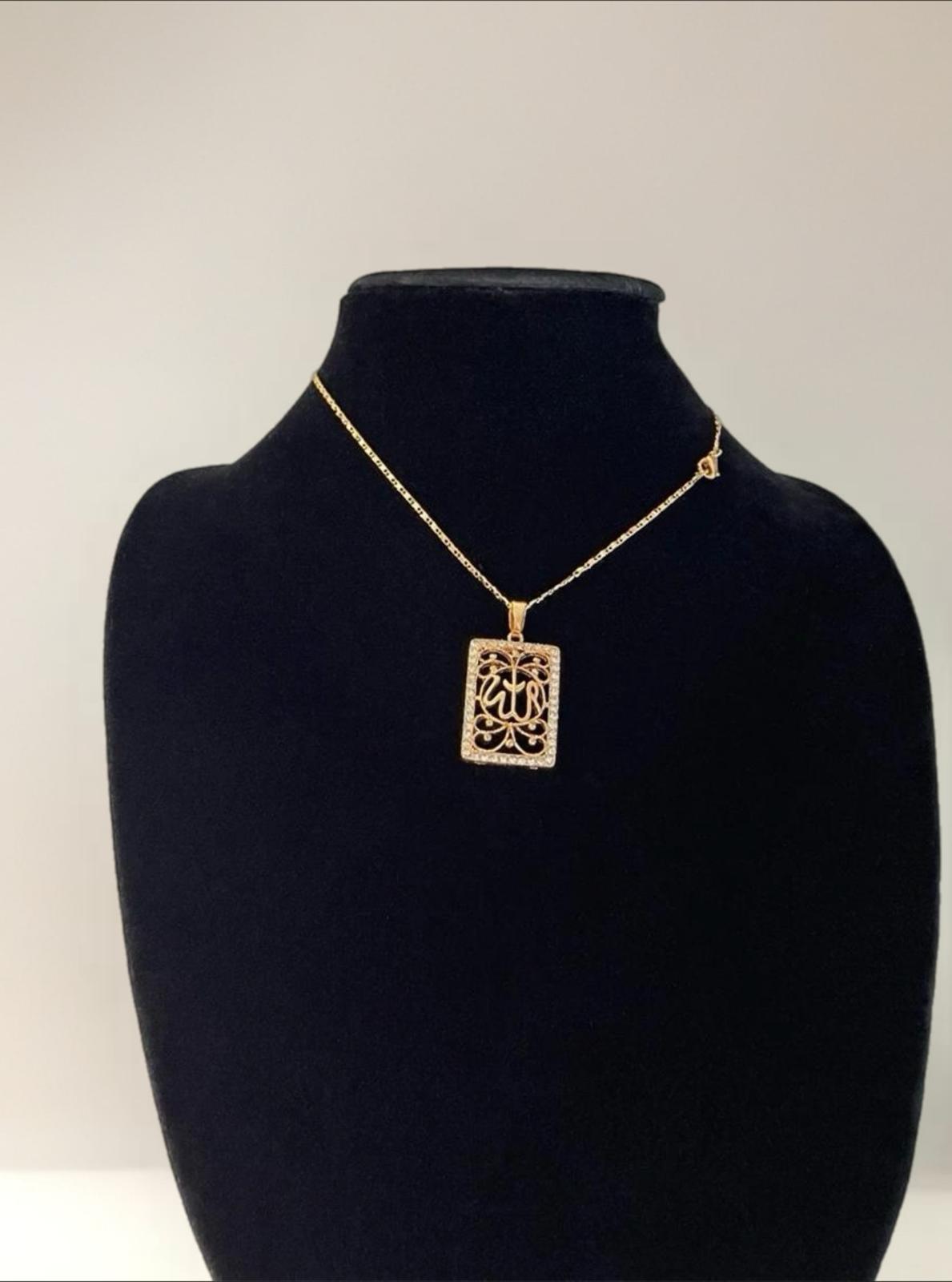 A stunning gold-plated Allah pendant beautifully adorned with sparkling zarcon stones, paired with an elegant matching chain. This piece blends spiritual significance with refined luxury, making it perfect for daily wear or special occasions.