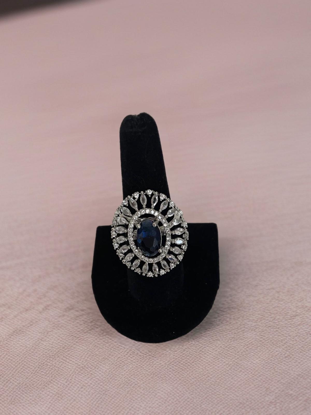 Elegant premium-quality adjustable ring, adorned with sparkling American Diamonds and a stunning Sapphire stone