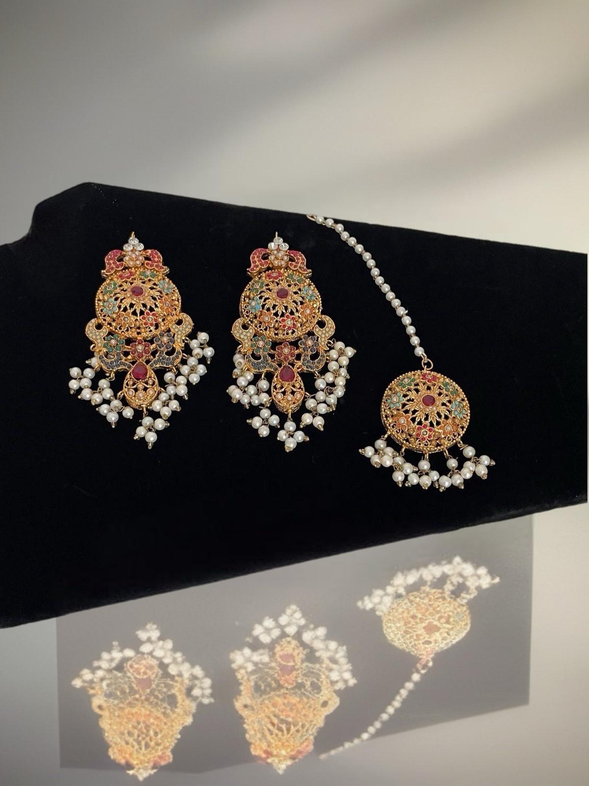 The earrings are perfectly paired with a matching tikka, making this set an ideal choice for weddings, festive occasions, or cultural celebrations.